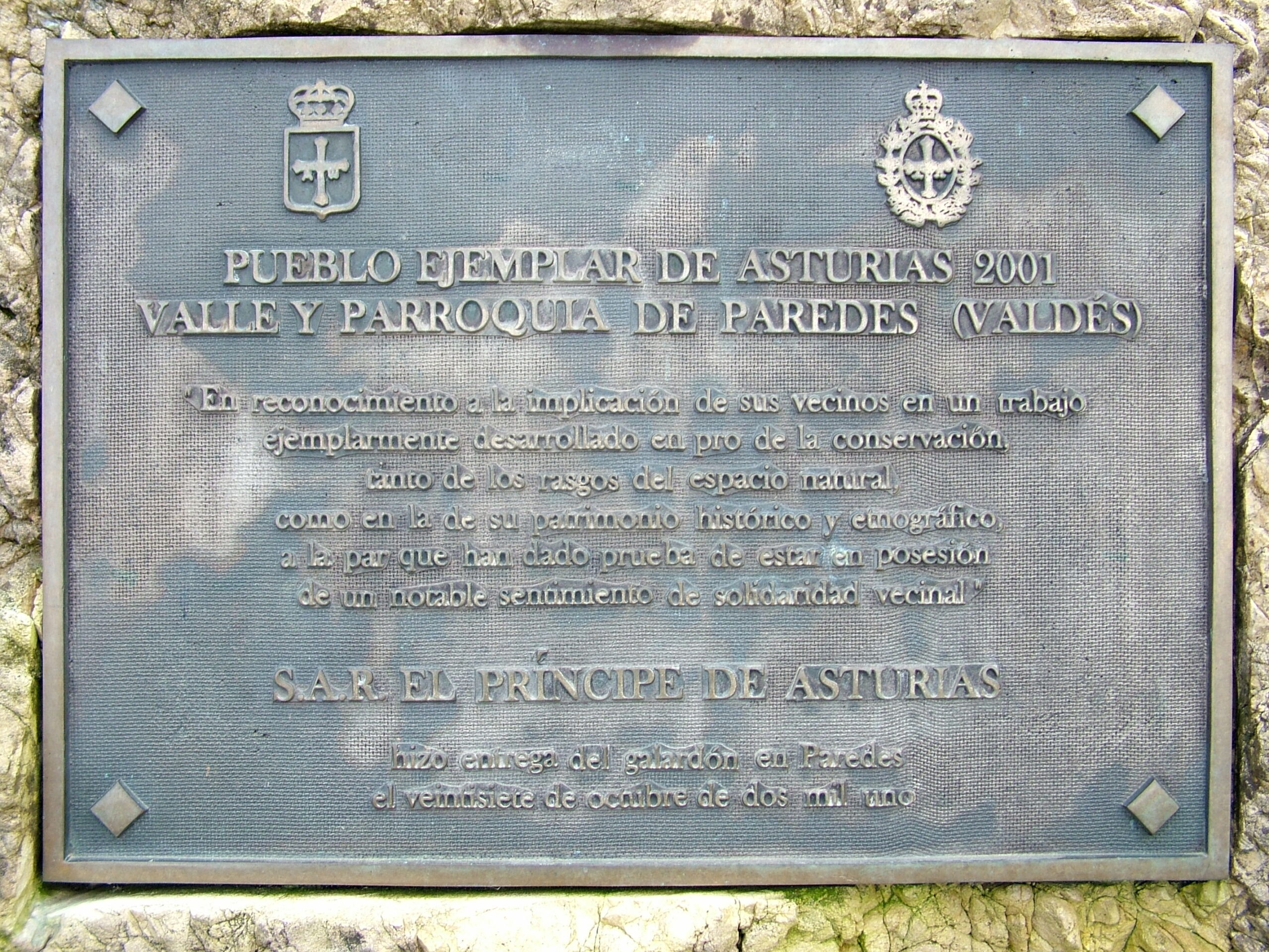 El 16 de septiembre de 2001, el jurado de los Premios Príncipe de Asturias reunido en Oviedo, acuerda por unanimidad nombrar al valle y parroquia de Paredes “Pueblo Ejemplar de Asturias 2001”.